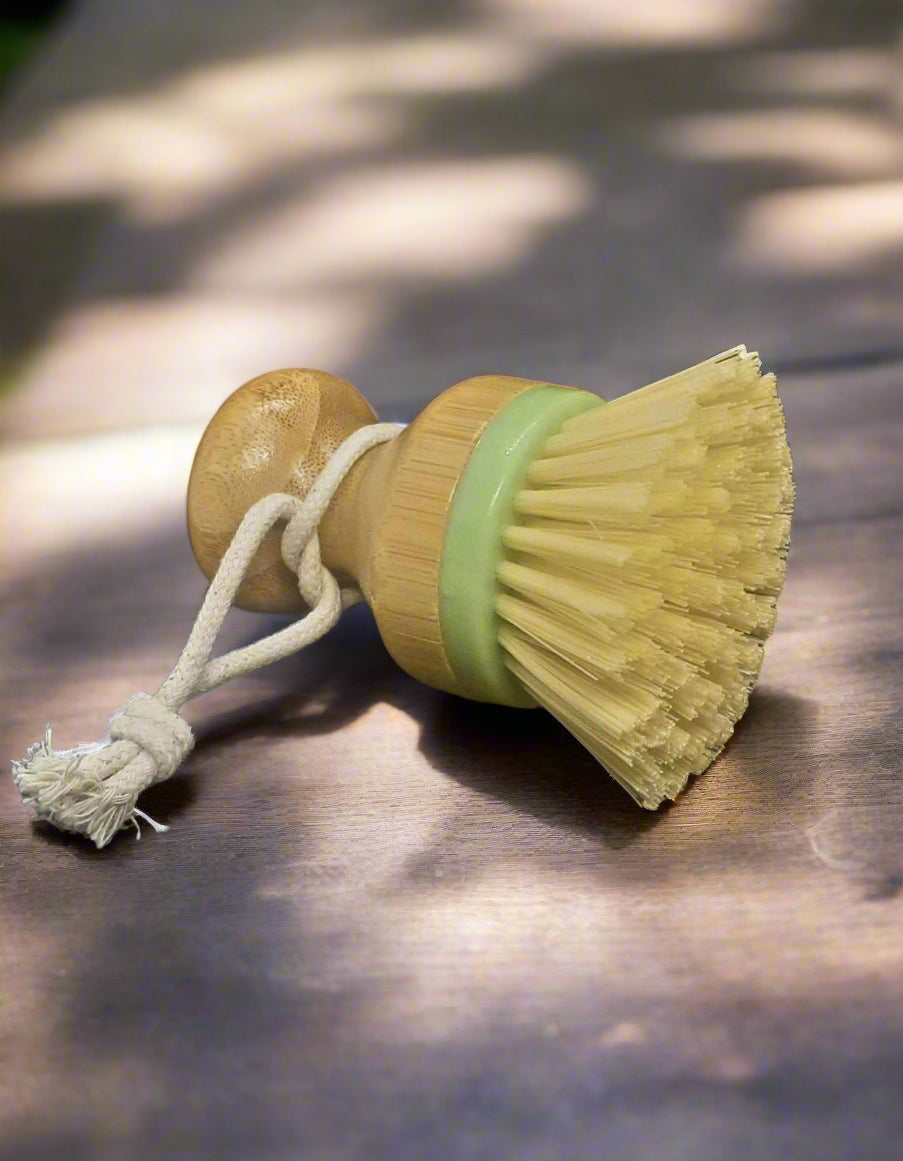 The bamboo scrub brush is tough on hard cooked on food without scratches and it works amazing with our all natural solid dish soap bar. (A go to for cleaning cast iron pans)